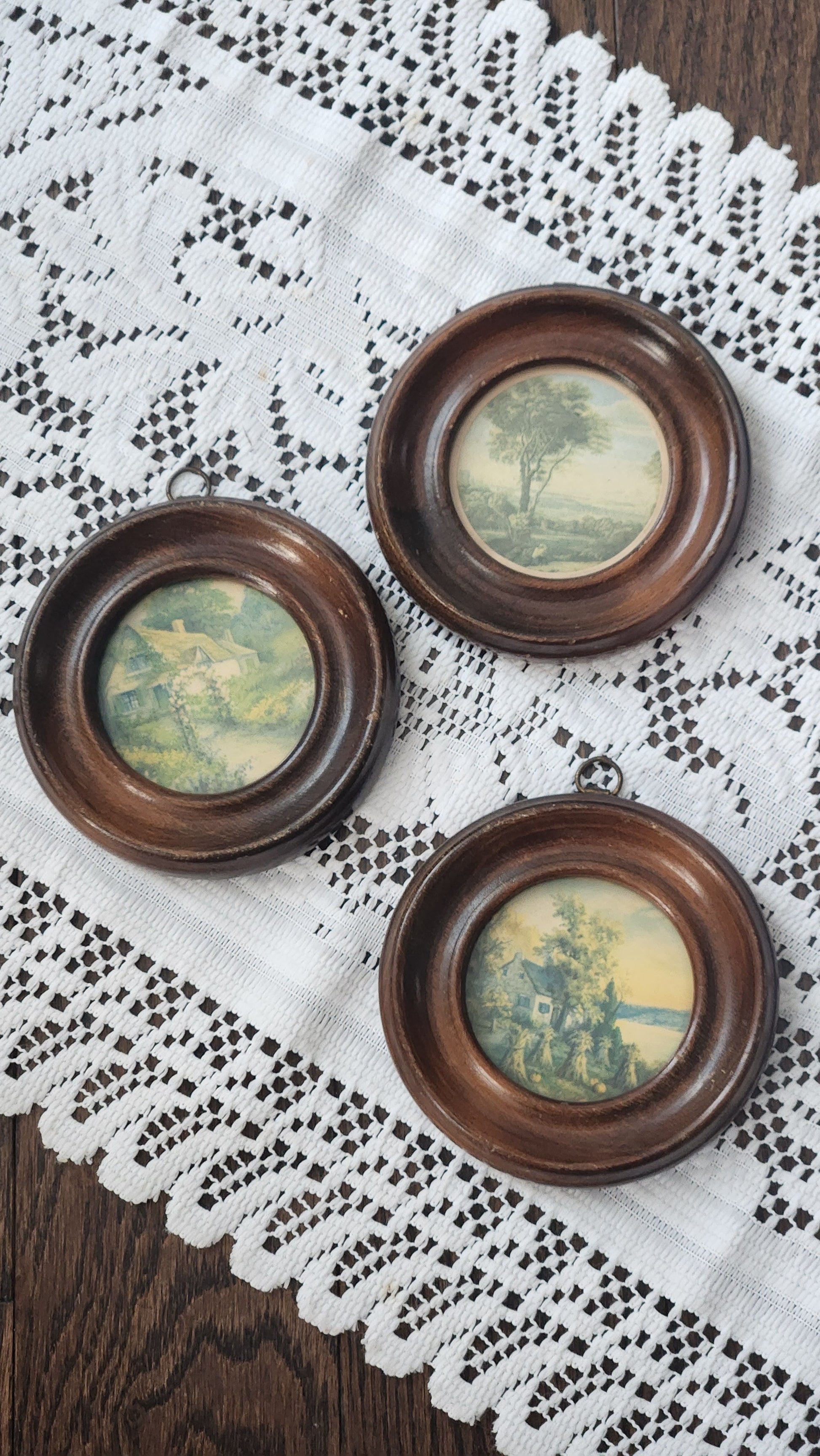 3 Small Vintage Round Wooden Frames with Cottage Prints