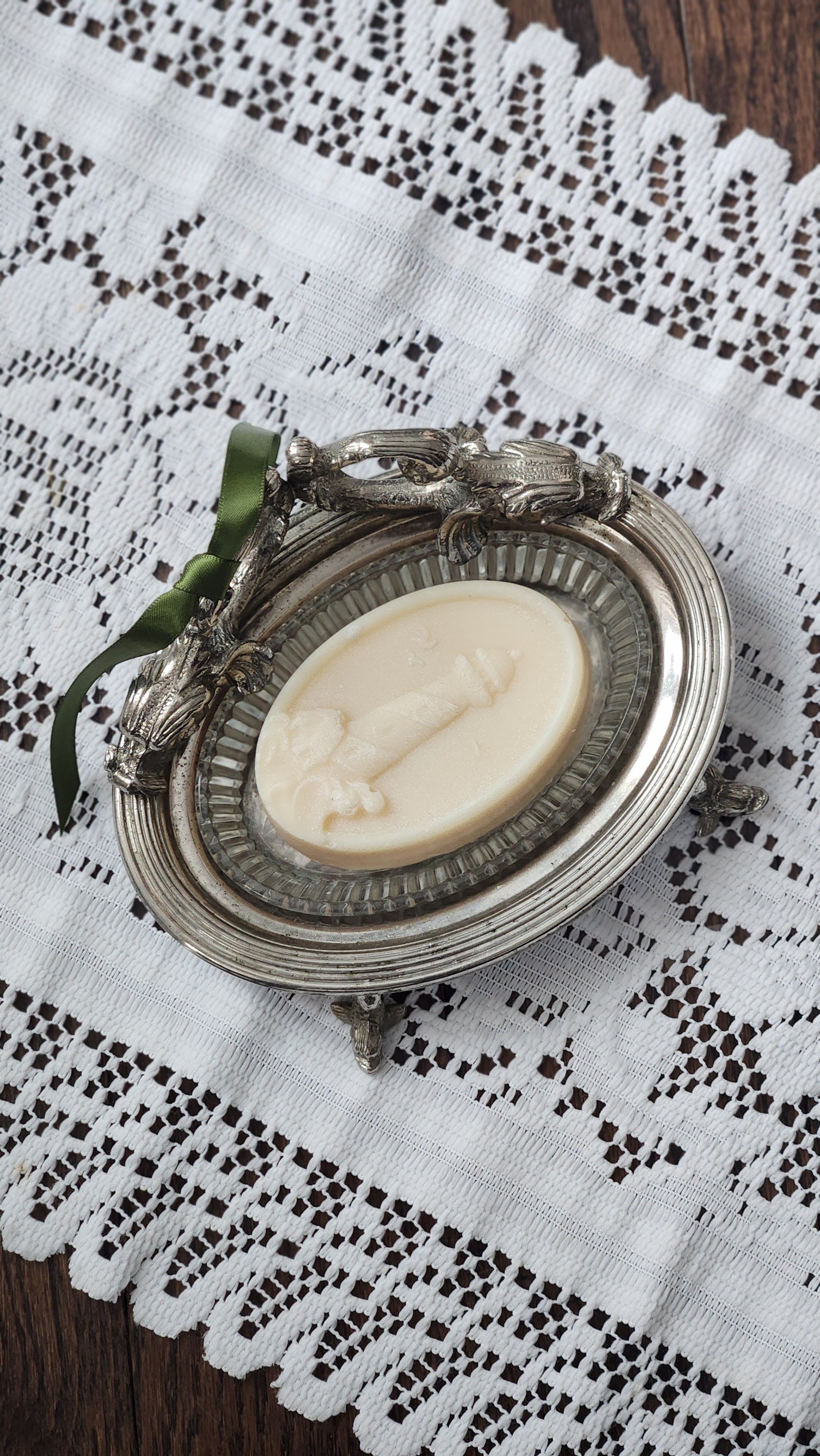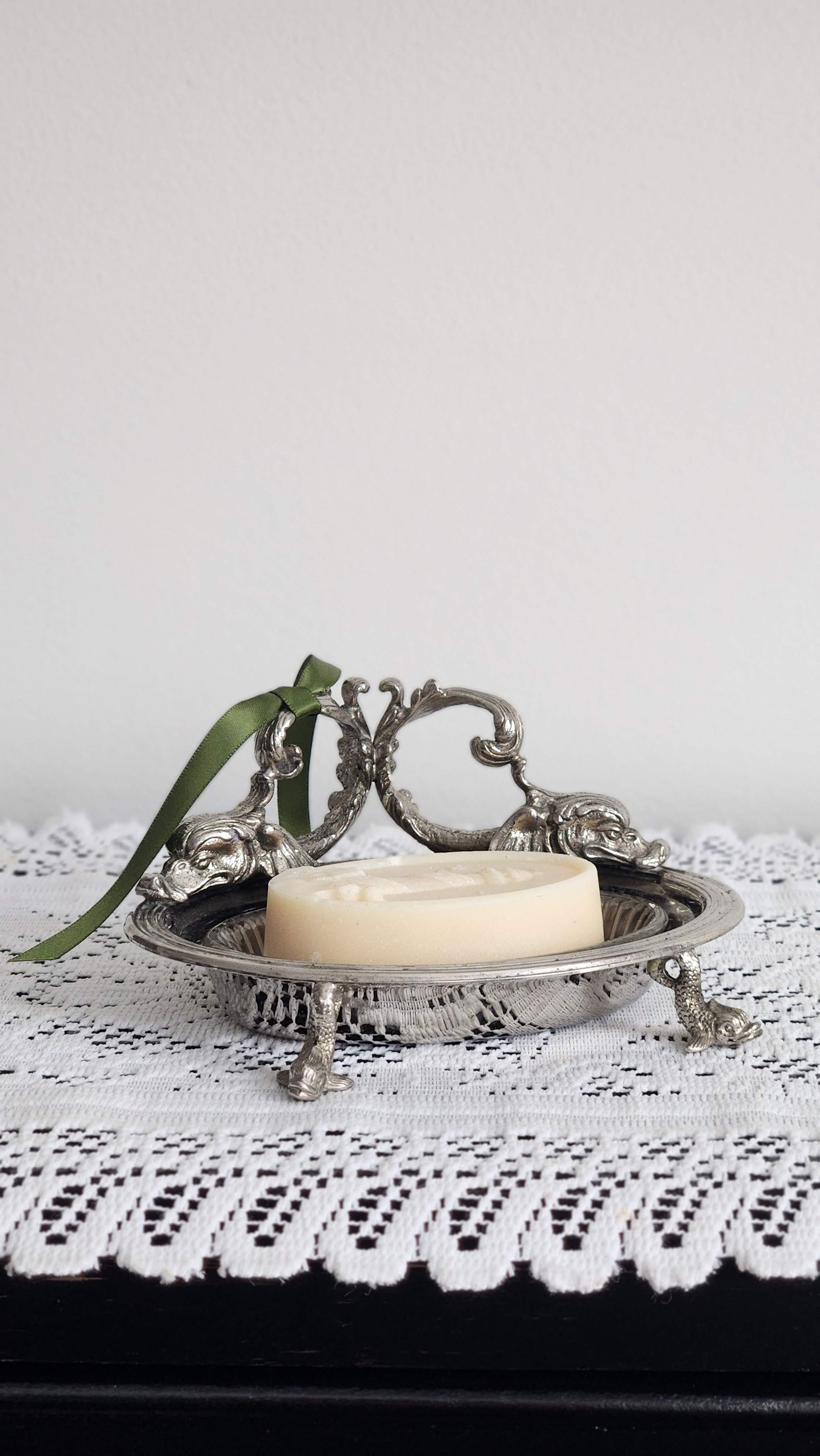 Elegant silver plate soap dish with glass insert, featuring charming gold fish footed design. Includes goat milk soap for a complete vintage bathroom accessory set.