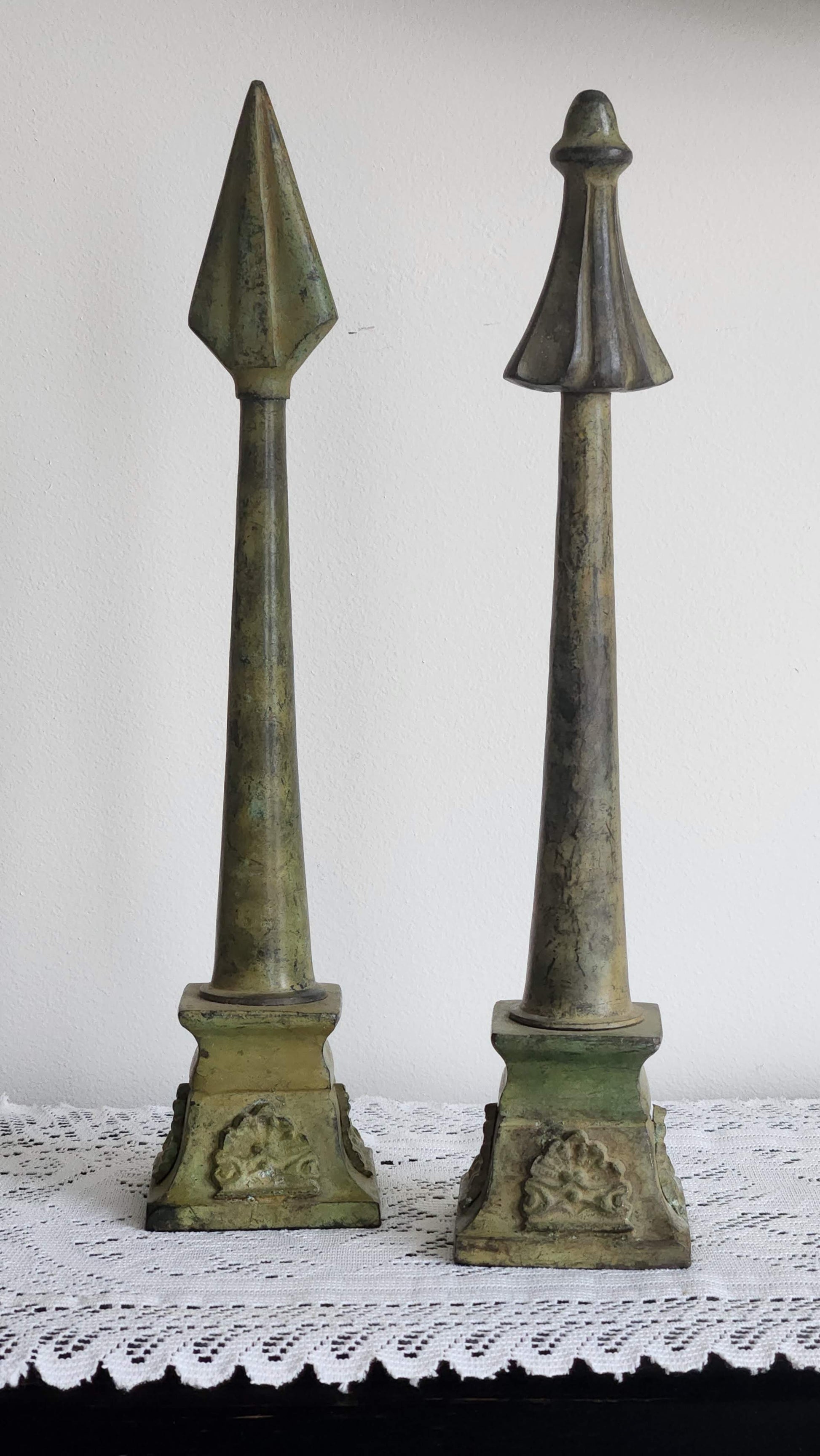 - Cast metal (non-ferrous) architectural finials with decorative verdigris finish.
